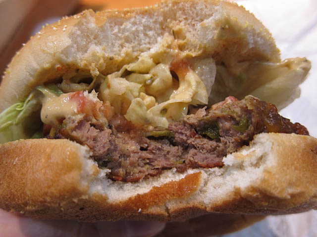 I went out yesterday to try Burger King’s new Jalapeño & Cheddar BK STUFFED STEAKHOUSE burger that I mentioned in my last post about novelty burgers. Fortunately the burger doesn’t look like the press shot, which looks a bit like Play-doh for the cheese and jalapeño bits. The cheese bits are melted in real life, which makes more sense. Made me think of the old Hormel Frank ‘N Stuff wieners stuffed with cheese in the 80’s.