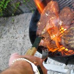 seth & katie throwdown the jersey bbq. grill chicken, sausage, steak, corn salad, salsa, tecate is taste good! suicide cocktail inventions make me hiccup like a drunk baby elephant. they say to do handstand to get rid hiccups. i do it. but nose starts bleeding. now hiccup and bloody nose. ride the party train back to brooklyn. we see a helicopter circling overhead shining a light down on axl and blind melon singer. at the bar my hiccup comes back. a girl tells me to hold my breath and think of three bald men i know. it works. i think of people with cancer.