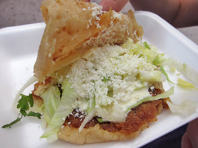 Then on the same block, we had a pupusa from a sidewalk vendor who had their own griddle. The lady stuffed it with lettuce, cheese, crema and paste made of chicharrón (fried pork skin). The chicharrón really got stuck in our teeth.